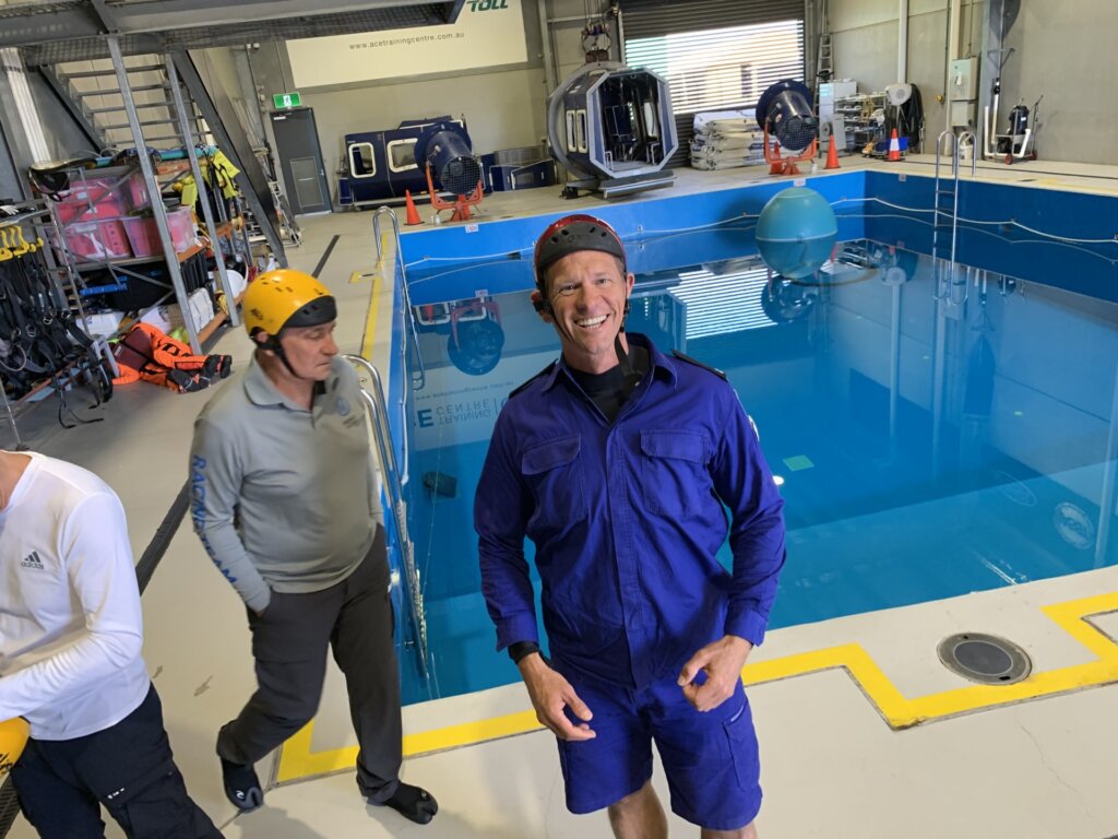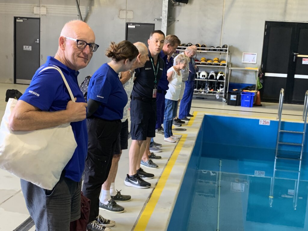 The day was challenging, fun and engaging. Marine Rescue attendees distinguished themselves with enthusiasm and demonstration of our skills and experience on the water. The highlight for most was being winched up by Toll’s Amanda Carroll, who was our paramedic/operator. She harnessed each attendee and pulled them towards the ‘helicopter’, 10 meters skyward in rain, wind and thunder. Admittedly this was simulated but was still stinging to the eyes and cold on the skin, discombobulating due to the wave generator – all ensuring that our decisions were made and tested in the most challenging of conditions.